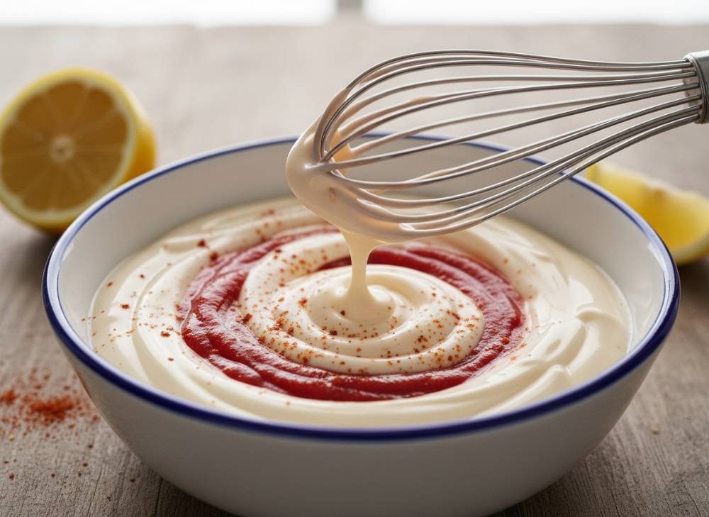 - Préparation de la Sauce (Le Secret de Sophie) : Dans un petit bol, mélangez la mayonnaise et le concentré de tomates. Ajoutez la moutarde, le paprika et le piment de Cayenne. Incorporez le jus de citron vert. Mélangez jusqu’à obtenir une sauce lisse et d’un rose orangé appétissant. Goûtez et rectifiez l’assaisonnement si nécessaire.