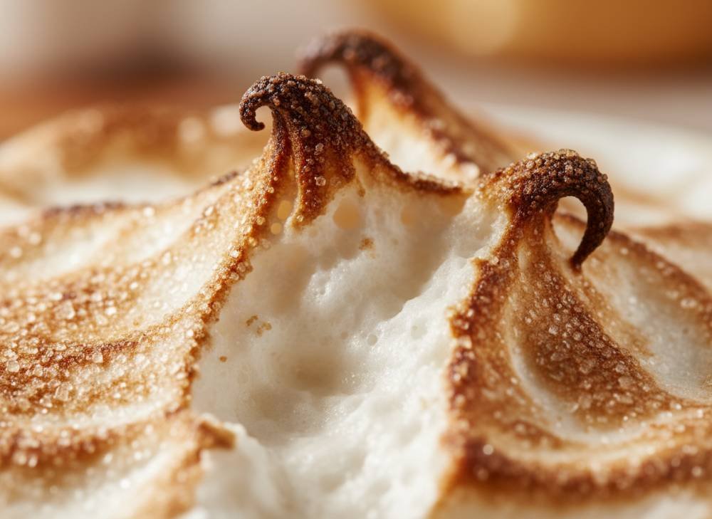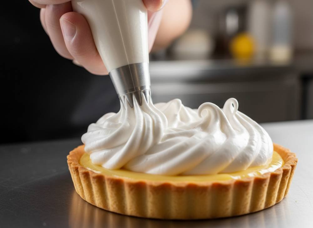 - Le Montage : À l’aide d’une poche à douille ou simplement d’une cuillère, disposez la meringue sur la crème au citron froide. Formez des petites pointes ou des vagues.