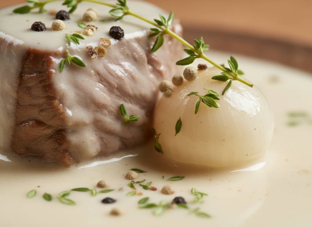 - Le Velouté de la Sauce : Contrairement aux sauces brunes, la blanquette utilise une “liaison” à l’œuf et à la crème qui lui donne une onctuosité incomparable.