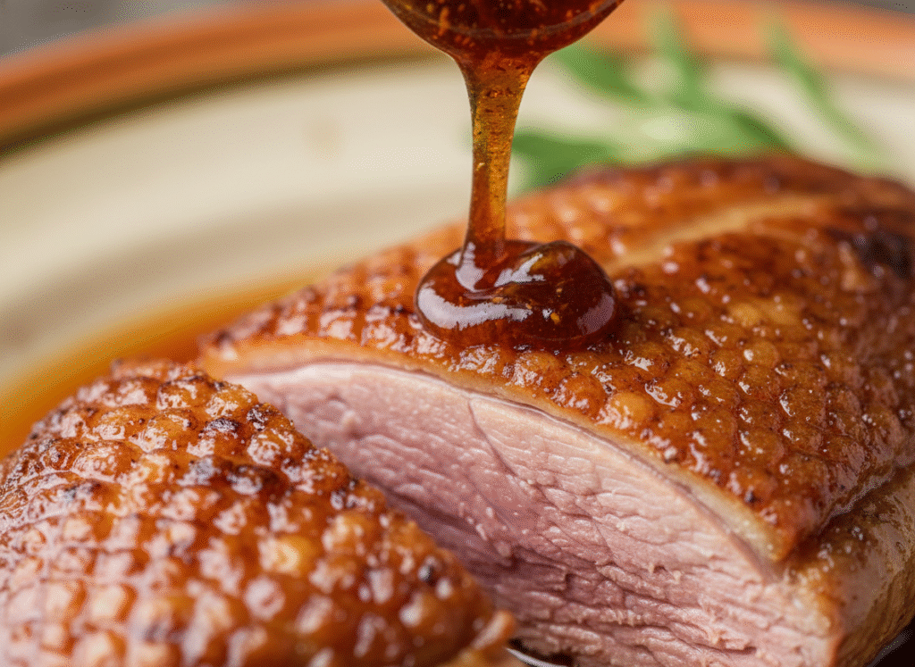 La texture est essentielle : une peau de canard dorée et croustillante qui contraste avec une chair tendre et juteuse. La sauce est nappante et onctueuse.