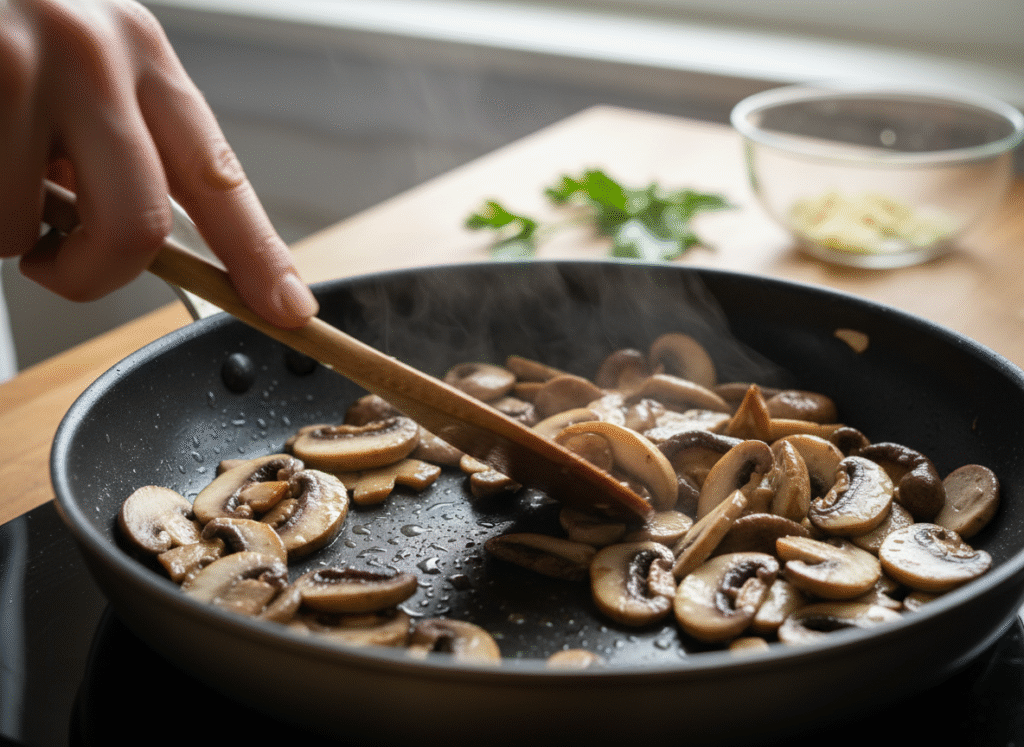 - Champignons et eau : Pour que les champignons dorent correctement, il est essentiel de les cuire d’abord sans matière grasse jusqu’à ce qu’ils aient rendu et perdu toute leur eau. C’est le secret pour une saveur concentrée.