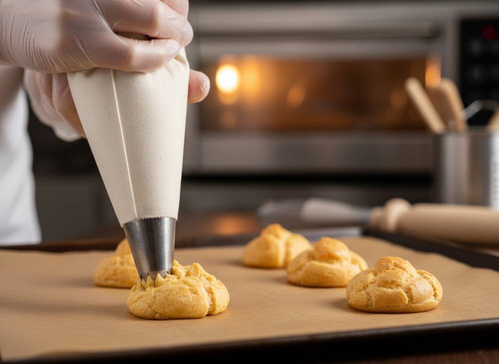 4. Le Dressage : Préchauffez le four à 180°C. À l’aide d’une poche à douille (ou de deux cuillères), formez des petites boules de la taille d’une noix sur une plaque recouverte de papier sulfurisé. Espacez-les bien car elles vont doubler de volume.