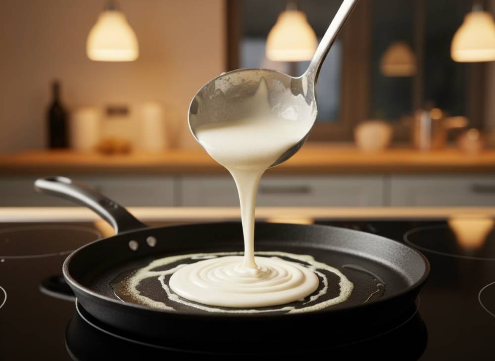 5. Le Repos (La patience du chef) : Laissez reposer la pâte au moins 30 minutes à température ambiante. Cela permet à l’amidon de la farine de gonfler et garantit des crêpes qui ne se déchirent pas à la cuisson.