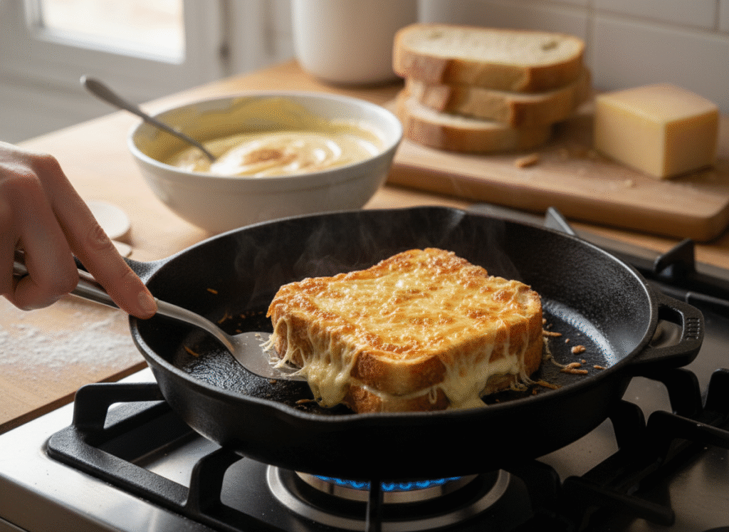 - Cuisson : Faites dorer les Croque-Monsieur dans une poêle beurrée à feu moyen des deux côtés (environ 2-3 minutes par face) jusqu’à ce que le pain soit bien doré. Terminez au four sous le grill quelques minutes (5-7 min) pour que le fromage du dessus gratine et fonde parfaitement.
