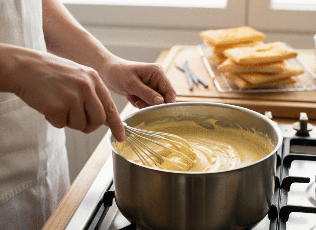 - Cuisson de la Crème : Versez le lait chaud (après avoir retiré la gousse) sur le mélange sans cesser de fouetter. Reversez le tout dans la casserole et faites cuire à feu moyen en remuant énergiquement jusqu’à ce que la crème épaississe et atteigne l’ébullition (laissez bouillir 1 minute pour cuire l’amidon). Retirez du feu, couvrez la crème de film alimentaire au contact pour éviter la formation d’une croûte, et laissez refroidir complètement.