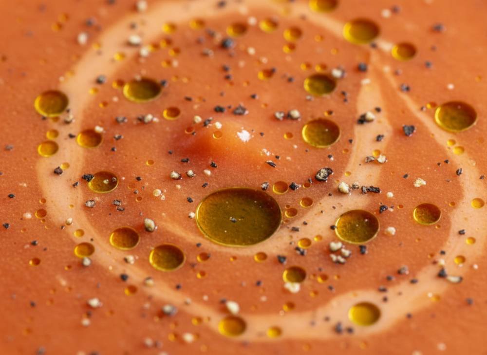 La texture est le point de discorde entre les puristes : certains l’aiment avec des morceaux (style gazpacho rustique), d’autres le préfèrent parfaitement lisse et émulsionné. Pour cette recette, nous visons une texture soyeuse et veloutée, presque crémeuse, obtenue grâce à l’émulsion de l’huile d’olive lors du mixage. C’est cette sensation de “velours froid” qui rend le gaspacho si addictif.