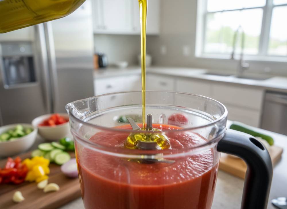 6. L’Émulsion (Le secret du chef) : Pendant que le blender tourne encore à vitesse moyenne, versez l’huile d’olive en filet. Comme pour une mayonnaise, l’huile va émulsionner la pulpe des légumes, transformant la couleur rouge vif en un orange-rouge crémeux et soyeux.
