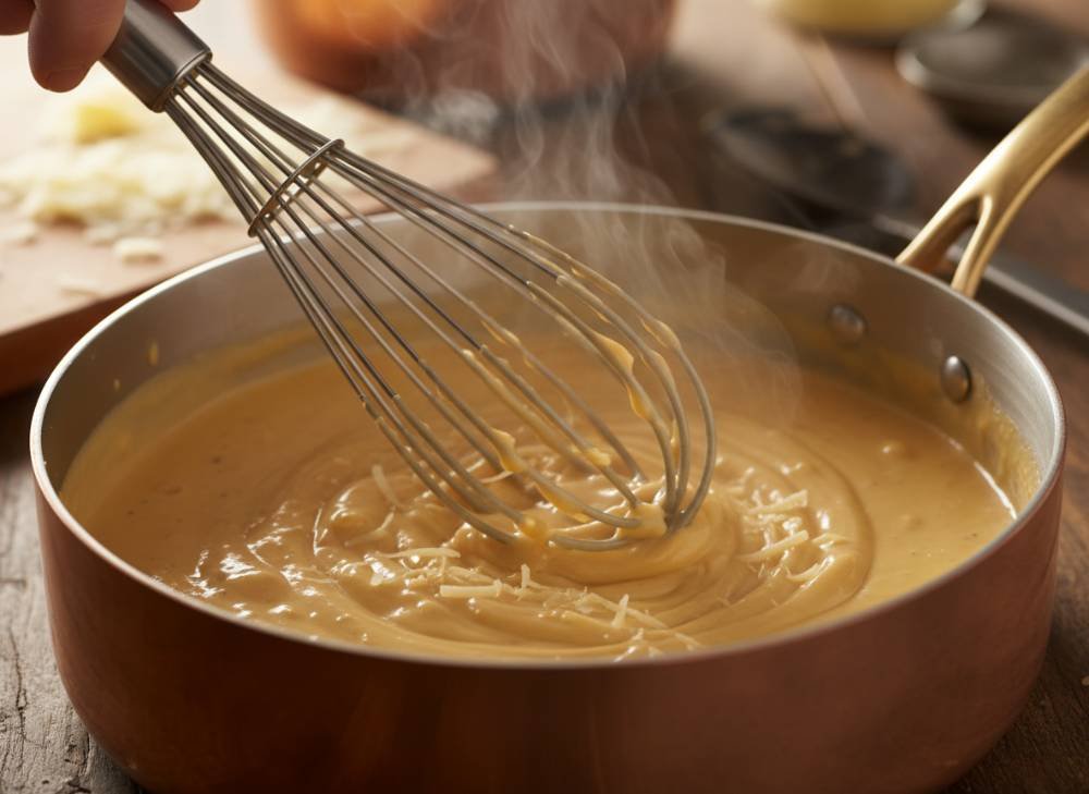 - La Sauce Mornay (L’étape clé) : Retirez du feu. Ajoutez les deux tiers du Comté râpé, la noix de muscade, le sel et le poivre blanc. Incorporez enfin la crème liquide. Mélangez jusqu’à ce que le fromage soit totalement fondu.