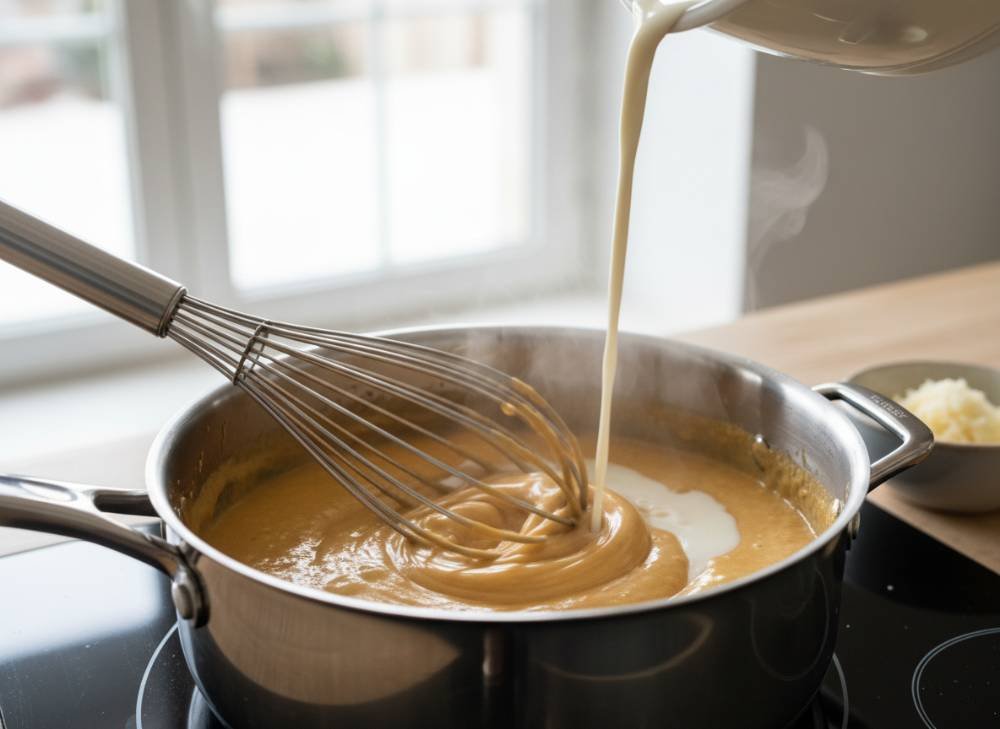 - La Création de la Sauce : Versez le lait petit à petit sur le roux, tout en fouettant sans arrêt pour éviter les grumeaux. Continuez de cuire à feu moyen jusqu’à ce que la sauce épaississe et devienne nappante.
