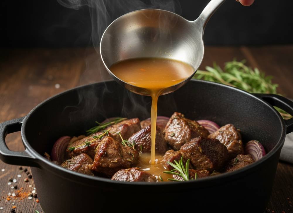 - Le mouillage : Versez progressivement le bouillon chaud tout en remuant pour bien décoller les sucs de cuisson. Le liquide doit recouvrir la viande. Ajoutez le bouquet garni.