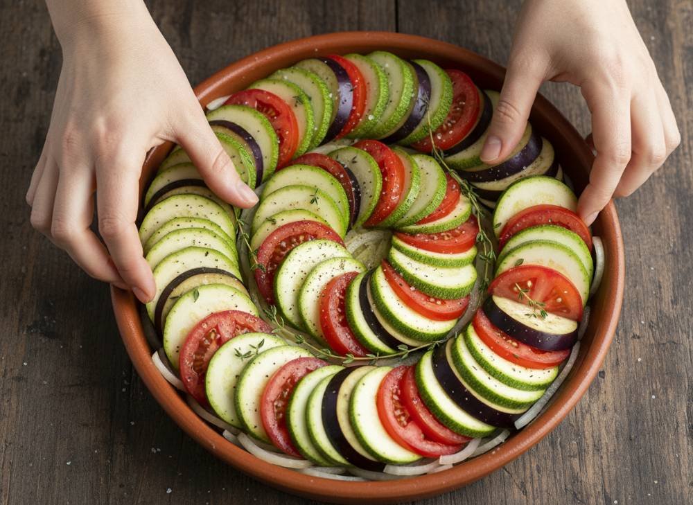 The Vegetable Tian is the sun-drenched soul of Provence. Unlike a Ratatouille where vegetables are stewed together, the Tian is a baked masterpiece where each vegetable slice retains its integrity while slowly confiting in high-quality olive oil and aromatics. It is named after the traditional shallow earthenware dish it is baked in.