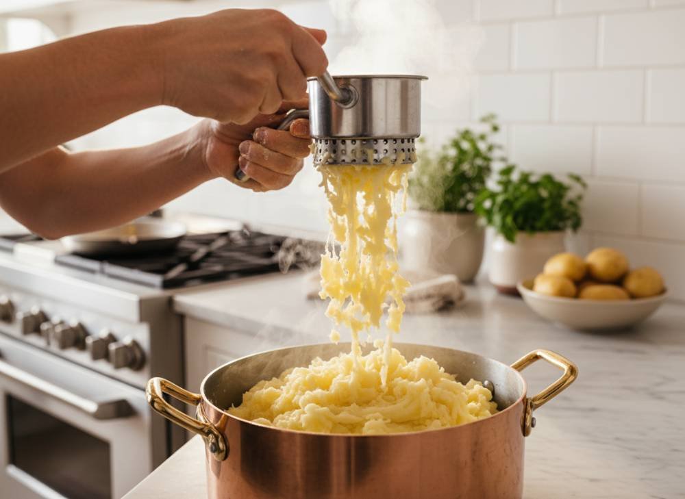 - Le Pressage (L’outil est roi) : Utilisez un presse-purée manuel ou un moulin à légumes. Attention : N’utilisez jamais un mixeur plongeant ou un blender ! La vitesse des lames brise les molécules d’amidon et transforme votre purée en une colle élastique immangeable.