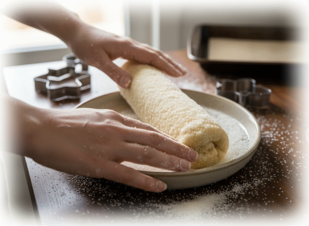- Façonnage et Repos (Étape clé) : Formez la pâte en un ou deux longs rouleaux d’environ 3-4 cm de diamètre. Enveloppez-les serrés dans du film alimentaire. Laissez reposer au réfrigérateur pendant au moins 1 heure (ou au congélateur 30 minutes) pour que le beurre durcisse et facilite la découpe.