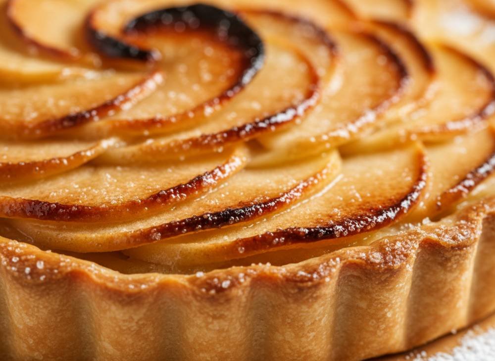 La texture est le point de réussite crucial : la pâte doit être extra-fine et bien cuite (ne pas hésiter à la “sécher” au four), tandis que les pommes sur le dessus doivent être fondantes, presque confites, avec des bords légèrement caramélisés par la chaleur.