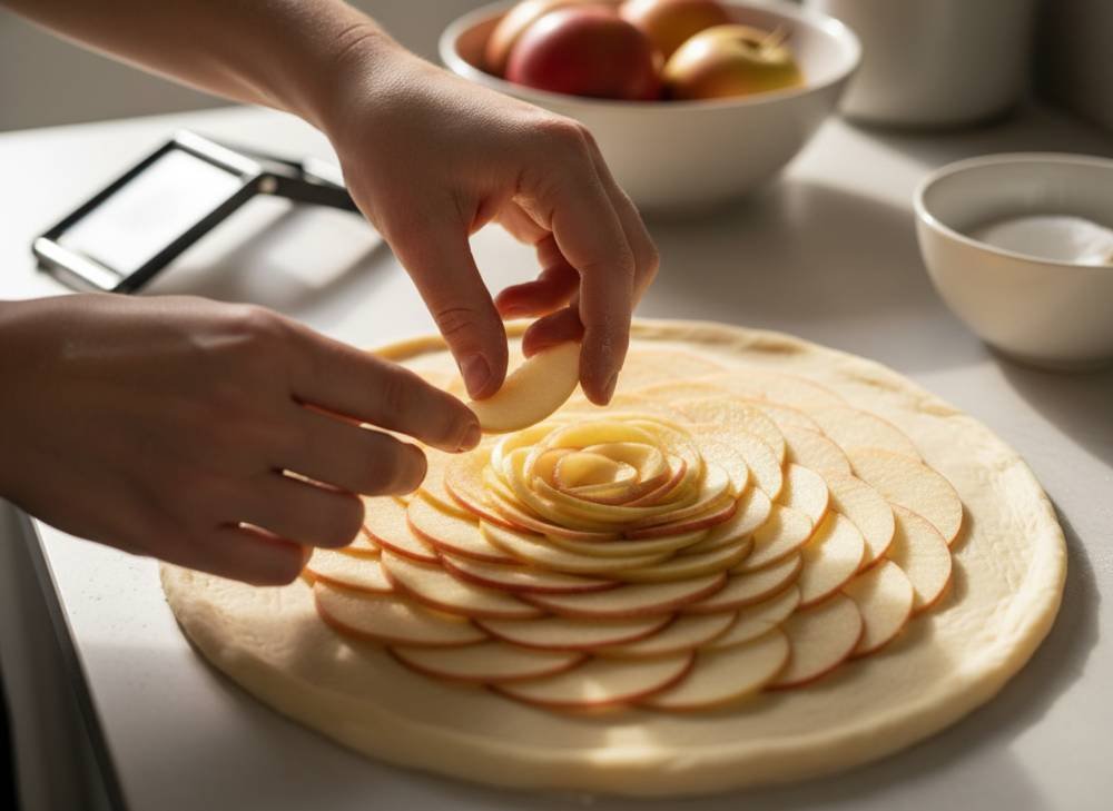 - Le Montage en Rosace : Disposez les lamelles de pommes en cercles concentriques en les faisant se chevaucher généreusement. Commencez par le bord extérieur et terminez par le centre. Serrez bien les rangs, car les pommes rétrécissent un peu à la cuisson.
